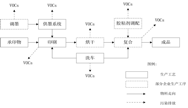 | 凹版印刷 | 溶劑型油墨、水性油墨 | 印刷與干燥過程排放VOCs,使用溶劑型油墨,VOCs排放濃度較高;使用水性油墨,VOCs排放濃度較低 | 酮、醇、醚、酯和芳烴類 |