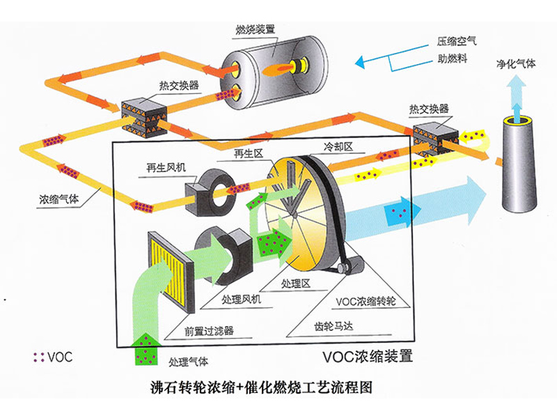 含廢氣的VOCs進入沸石轉(zhuǎn)輪。此時廢氣中的VOCs大部分被流道上的沸石吸附,使廢氣中的VOCs含量大大降低,成為一種較清潔的氣體。廢氣排放到大氣中后,經(jīng)車輪吸附和高溫解吸后成為高濃度的VOCs氣體??梢越档秃罄m(xù)處理程序的運行成本。沸石選礦轉(zhuǎn)輪是將高風(fēng)量和低濃度的廢氣分別濃縮成低風(fēng)量和高濃度的廢氣。然后,通過催化燃燒將有機組分轉(zhuǎn)化為無害的co2和h2,去除VOCs。