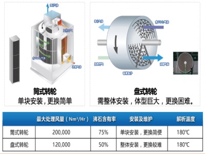 根據(jù)處理風量、VOCs成分的不同,可以選擇筒式轉(zhuǎn)輪或者盤式轉(zhuǎn)輪進行處理。