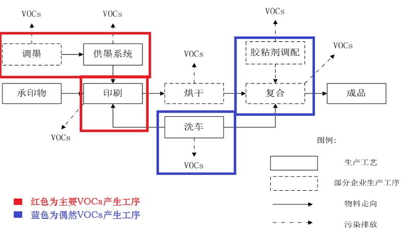 1、客戶采用溶劑型油墨,溶劑成分較復(fù)雜,VOCs排量較大。VOCs的主要產(chǎn)生工序如下圖:
