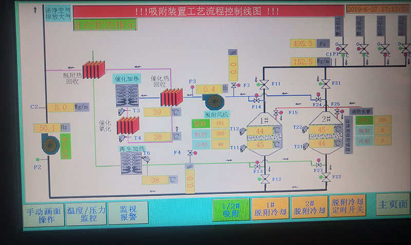 5、為了節(jié)約投資和運行費用,系統(tǒng)采用兩個活性炭吸附箱,一備一用,偶爾在三條生產(chǎn)線全開的情況下,兩箱同時啟用;白天吸附,晚上錯峰用電期間啟動脫附再生和催化燃燒裝置,最大程度的節(jié)約了運行費用。/6、系統(tǒng)采用PLC全自動控制,可切換手動模式。配備VOC濃度在線監(jiān)測聯(lián)動、脫附和催化燃燒溫度在線監(jiān)測聯(lián)動、自動噴淋消防系統(tǒng)聯(lián)動,一鍵啟動,安全無憂。
